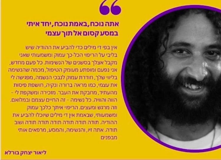 לפני כמה שנים חוויתי אירוע מוחי וזה פגע לי בדיבור באופן קשה, הייתי צריך ללמוד מחדש לדבר. לא ישנתי, היו לי מחשבות טורדניות והחיים שלי היו בירידה תלולה מטה. הייתי בדיכאון, כי אני גם שחקן, במאי, מורה למשחק, מדבב ומקליט ספרים. הקול הוא הכלי שלי. וגם היתה לי אז ילדה שהיא בת שנה וחצי. מתוך הדיכאון עברתי טיפול ריברת׳ינג. אחרי 4 טיפולים הבנתי שזהו, זה הייעוד שלי. לעזור לנשים במשבר. אז החלטתי ללמוד נשימה מעגלית. עשיתי שני מחזורים גם של מטפל וגם של מאסטר.