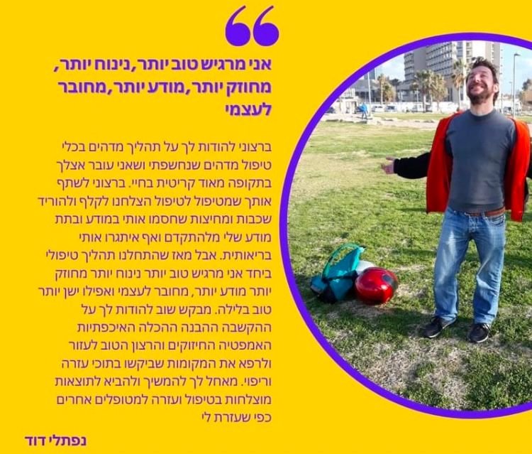 עברתי בעצמי את הטיפול, ולכן אני מכיר מבפנים את העוצמה שלו, את הרגישויות, את האתגרים ואת המקומות שבהם מתרחש השינוי האמיתי. החוויה האישית מאפשרת לי ללוות מתוך הבנה, אמפתיה ודיוק גבוה.
